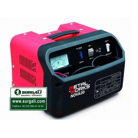 Cargador de Batería Nova 30 monofásico y portátil, adecuado para baterías de plomo 12/24 Vol. Protegido contra sobrecarga y polaridad. Equipado con amperímetro. Posibilidad de uso en condiciones adversas. Cargador de Baterías ideal para turismos, todoterreno y camiones. Uso no industrial.