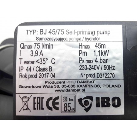 Bomba centrífuga autocebante de una sola etapa, equipada con un sistema que mejora su rendimiento de cebado debido al uso del tubo de Venturi. El cuerpo de la bomba está hecho de hierro fundido. Equipada con protección térmica y cable de alimentación. Rendimiento de la bomba de hasta 8 m. Rendimiento del motor 1,1 kW. Fuente de alimentación - corriente monofásica 230V ~ / 50Hz