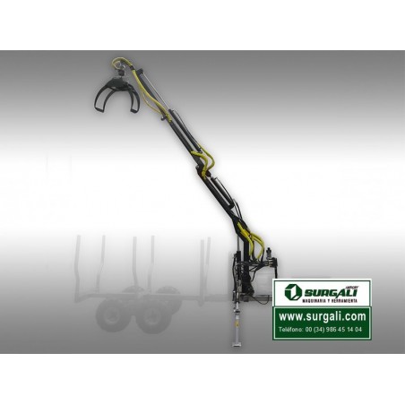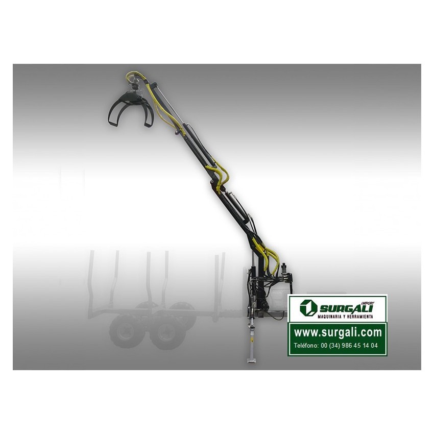 Grúa forestal fabricada en acero de alta resistencia. Muy versátil y rentable. Montaje sencillo en el tractor. Con grupo, bomba y deposito hidráulico incorporado en la grúa.
