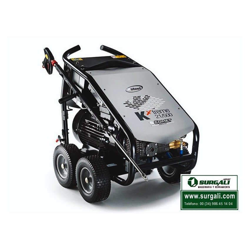Chasis robusto pintado con tratamiento anti-corrosivo. Cubierta de acero inoxidable. Práctico alojamiento de pistola y lanza. Filtro de aspiración auto limpiante de cartucho ampliamente. Sobredimensionado, con elevado poder filtrante. Ruedas de espuma con cubo de acero con efecto neumático. Motor eléctrico (1400 rpm) 30 HP. Bombas triplex Comet TW Premium. Acoplamiento motor-bomba mediante junta elástica. Válvula automática de regulación con bypass externo y restablecimiento gradual de la presión. Válvula termostática de protección de temperatura excesiva. Panel de puesta en marcha estrella-triángulo con mandos de baja tensión (24V). Telerruptor y protección del motor con relé térmico. Botón de parada de emergencia. Cuenta horas. Uso altamente profesional