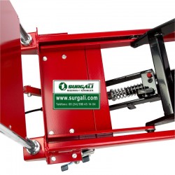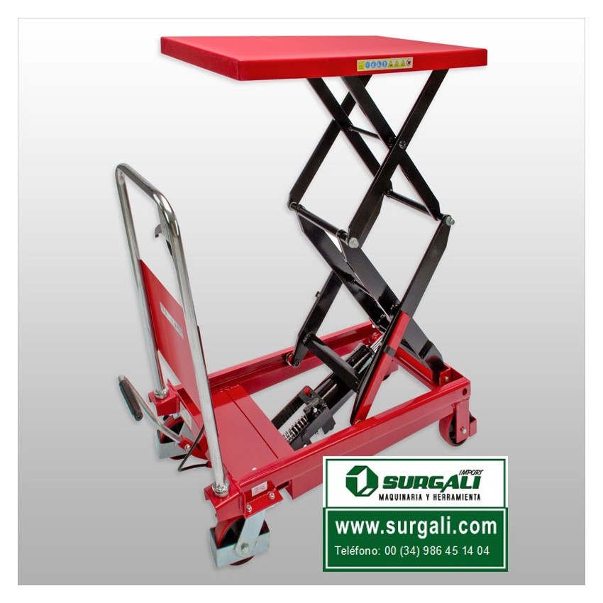 Práctica plataforma elevadora hidráulica. Es ideal para uso en almacenamiento, talleres, naves… Diseño de acero robusto. Accionamiento hidráulico con guía paralela. Sencillo mecanismo de bajada de la plataforma mediante palanca con mecanismo de seguridad para evitar la bajada accidental.