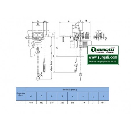 POLIPASTO ELÉCTRICO DE CADENA CON CARRO PROFESIONAL 1000 KG. 18 METROS