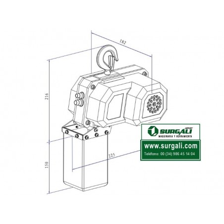 Polipasto eléctrico de cadena, con una longitud de cadena de 3 metros. Parada automática de emergencia. Instalación fácil y rápida gracias a su diseño ligero y compacto. Motor monofásico de 230 Voltios sin mantenimiento. Equipado con un mando por cable con 150 cm. de longitud.