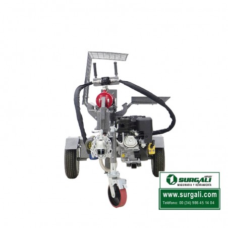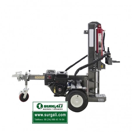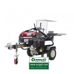 Rajadora de leña a gasolina, con un motor de 4 tiempos y 15 CV a 3600 rpm. Esta astilladora puede trabajar en dos posiciones, vertical y horizontal. Las máquinas de este tipo que se comercializan son lentas, un ciclo tarda entre 11 y 13 segundos. La nuestra es con diferencia la más rápida del mercado, un ciclo dura tan sólo 6 segundos.