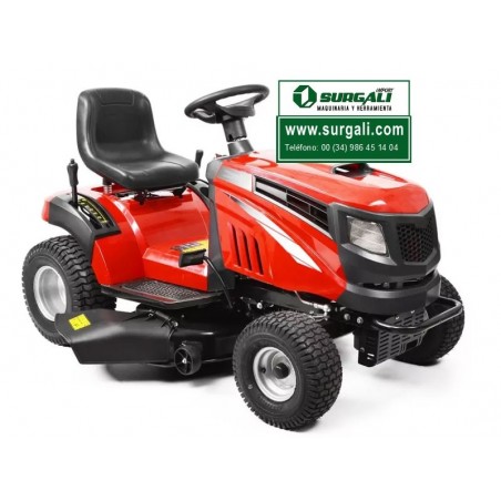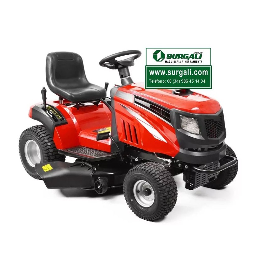 Tractor cortacésped con motor LONCIN monocilíndrico de 9,2 Kw. 12,5 Cv., anchura de trabajo de 86 cm., una velocidad máxima de 8,8 km/h., con un ajuste central de la altura, rodamientos de bolas y una cesta recolectora de 245 litros.